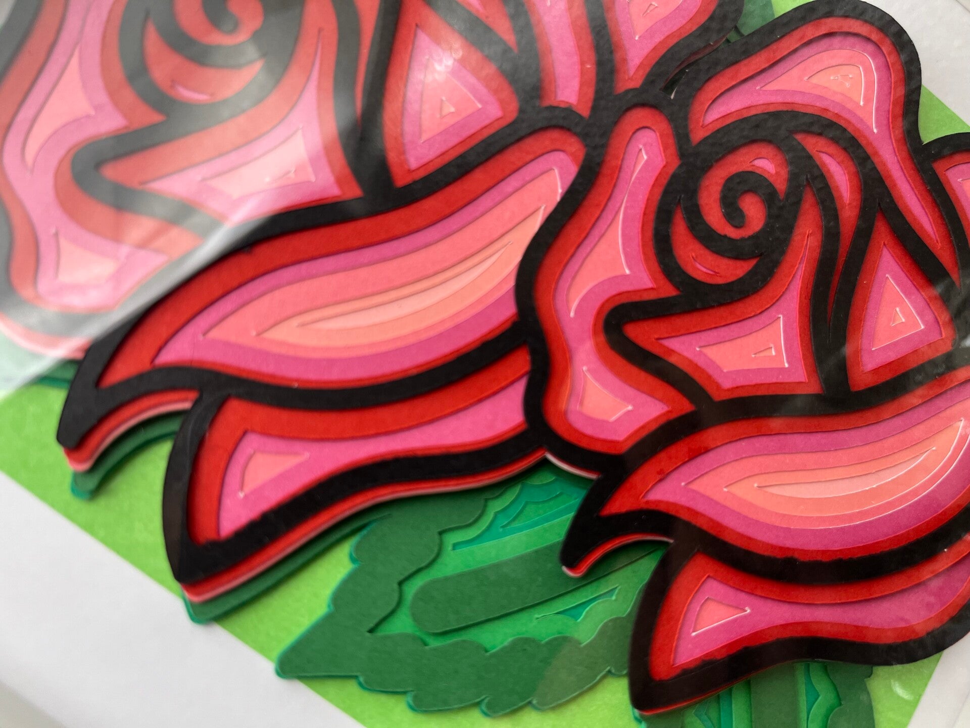 This stunning handcrafted image features two delicately intertwined roses, lovingly crafted from layers of pink, green, and black premium cardstock. Each petal and leaf is carefully shaped to create a sense of depth and intimacy, capturing the timeless beauty of connection.
