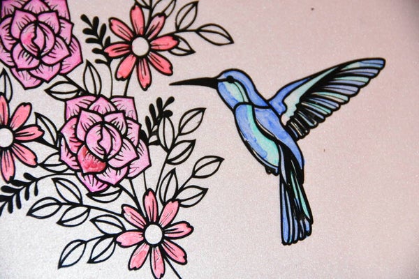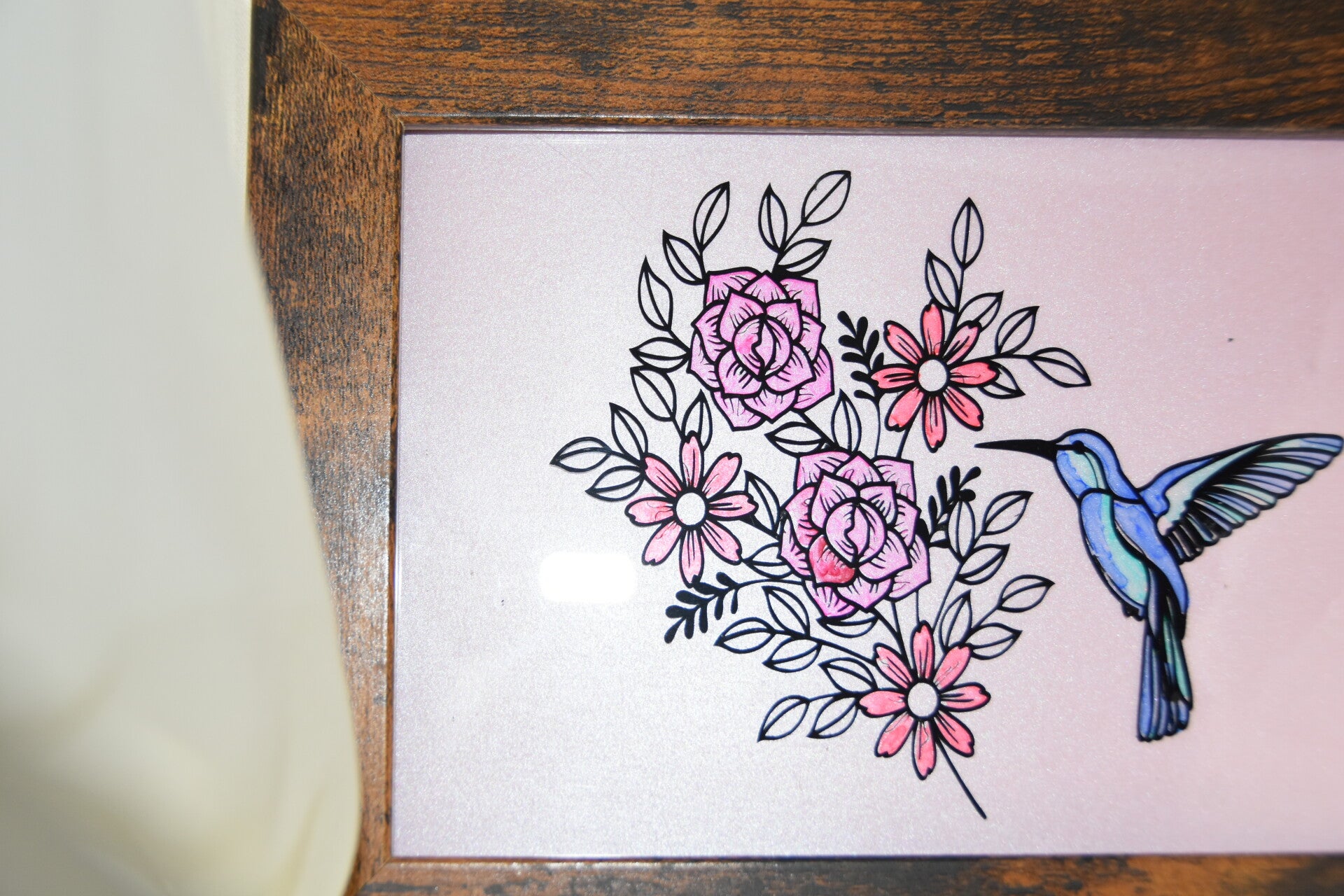 This beautiful and intricate artwork captures the delicate elegance of a hummingbird in motion, surrounded by vibrant blooms. Expertly crafted using black permanent vinyl and coloured with rich marker tones, the design radiates charm and detail.