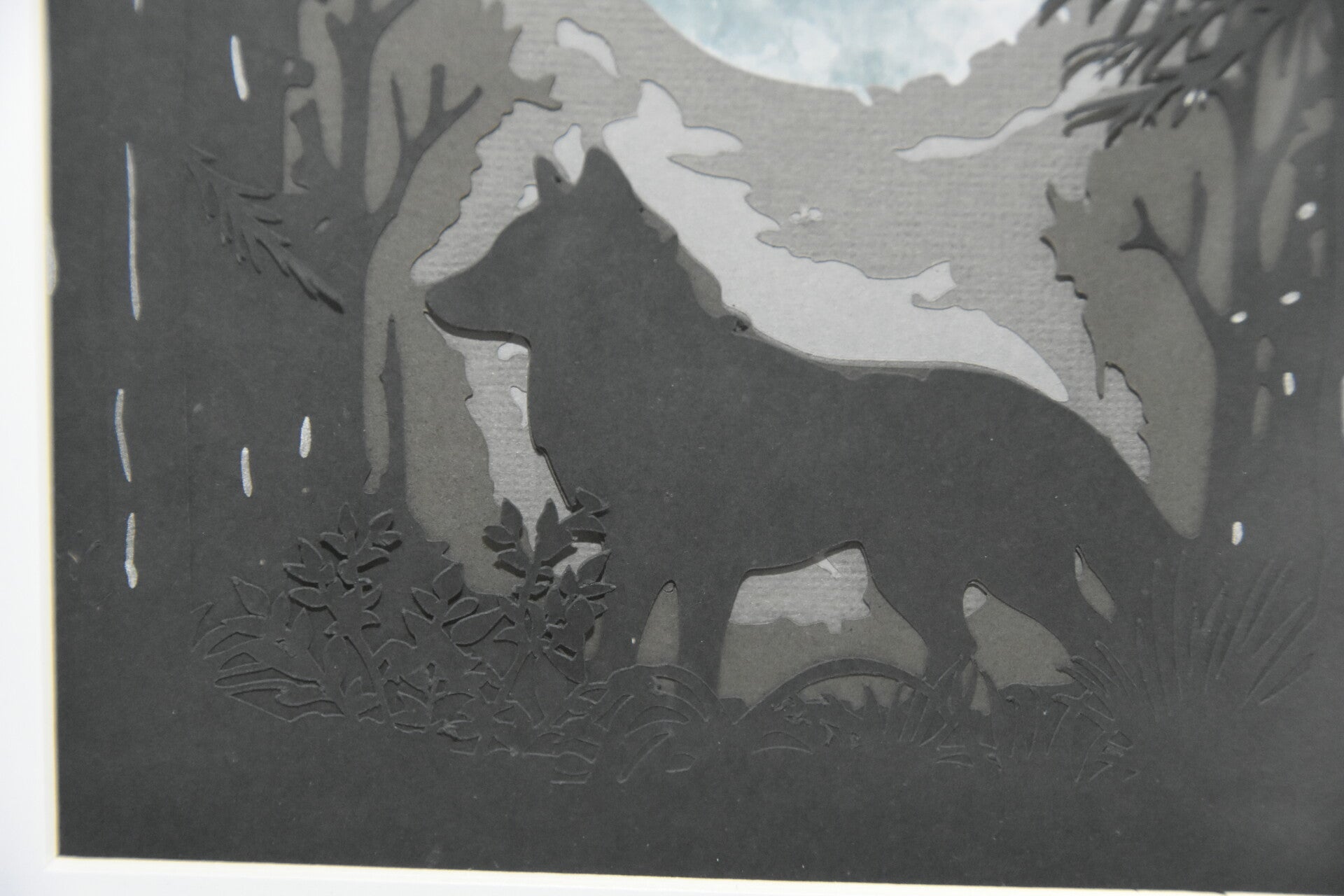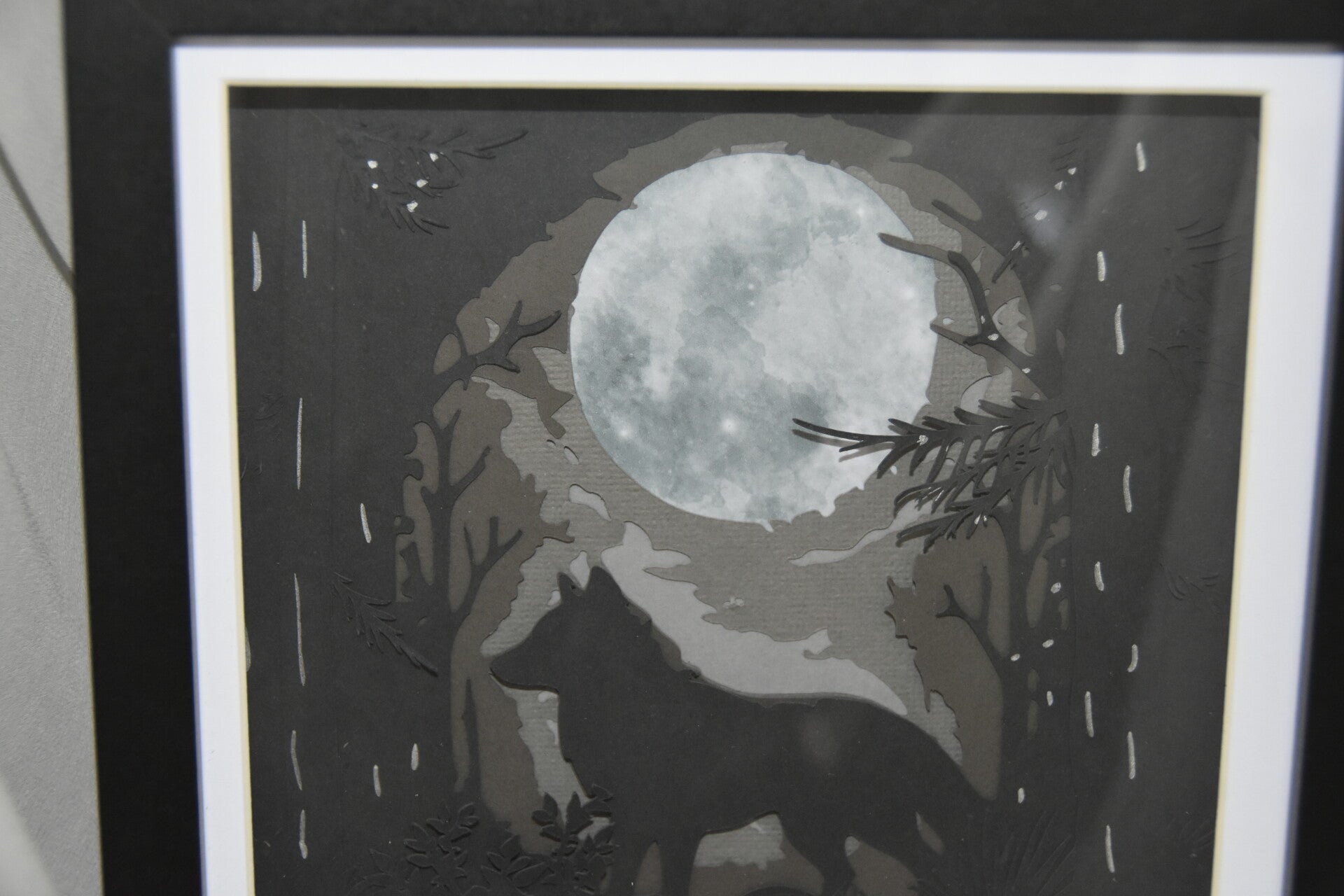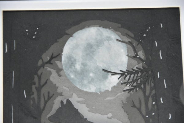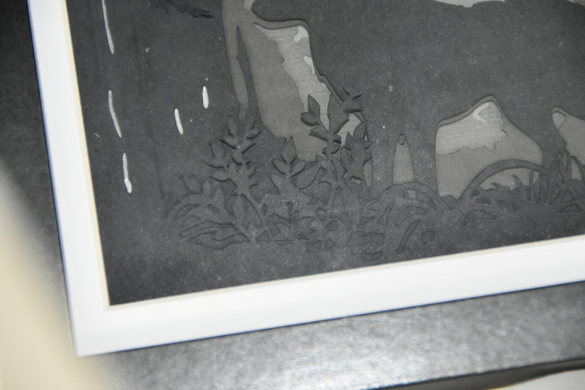Crafted with layered precision and presented in a sleek black frame (18x18cm), the artwork draws the eye and stirs the imagination—perfect for lovers of nature, folklore, or dramatic monochrome design.