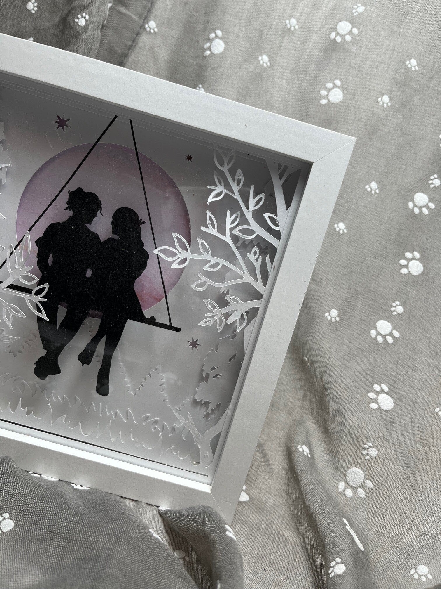 Show your partner just how much they mean to you with this enchanting illuminated artwork, featuring two lovers sharing a serene moonlit evening. Each silhouette is delicately hand-cut from premium card, capturing the intimacy and magic of the moment with stunning precision.