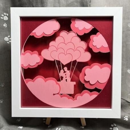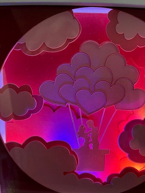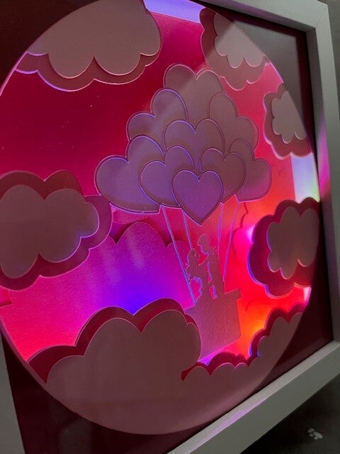 Take romance to new heights with this beautifully handcrafted lightbox picture, featuring a dreamy balloon ride for two. Each layer is precision-cut from high-quality pink cardstock and assembled with care using foam pads and glue to create a stunning 3D effect.