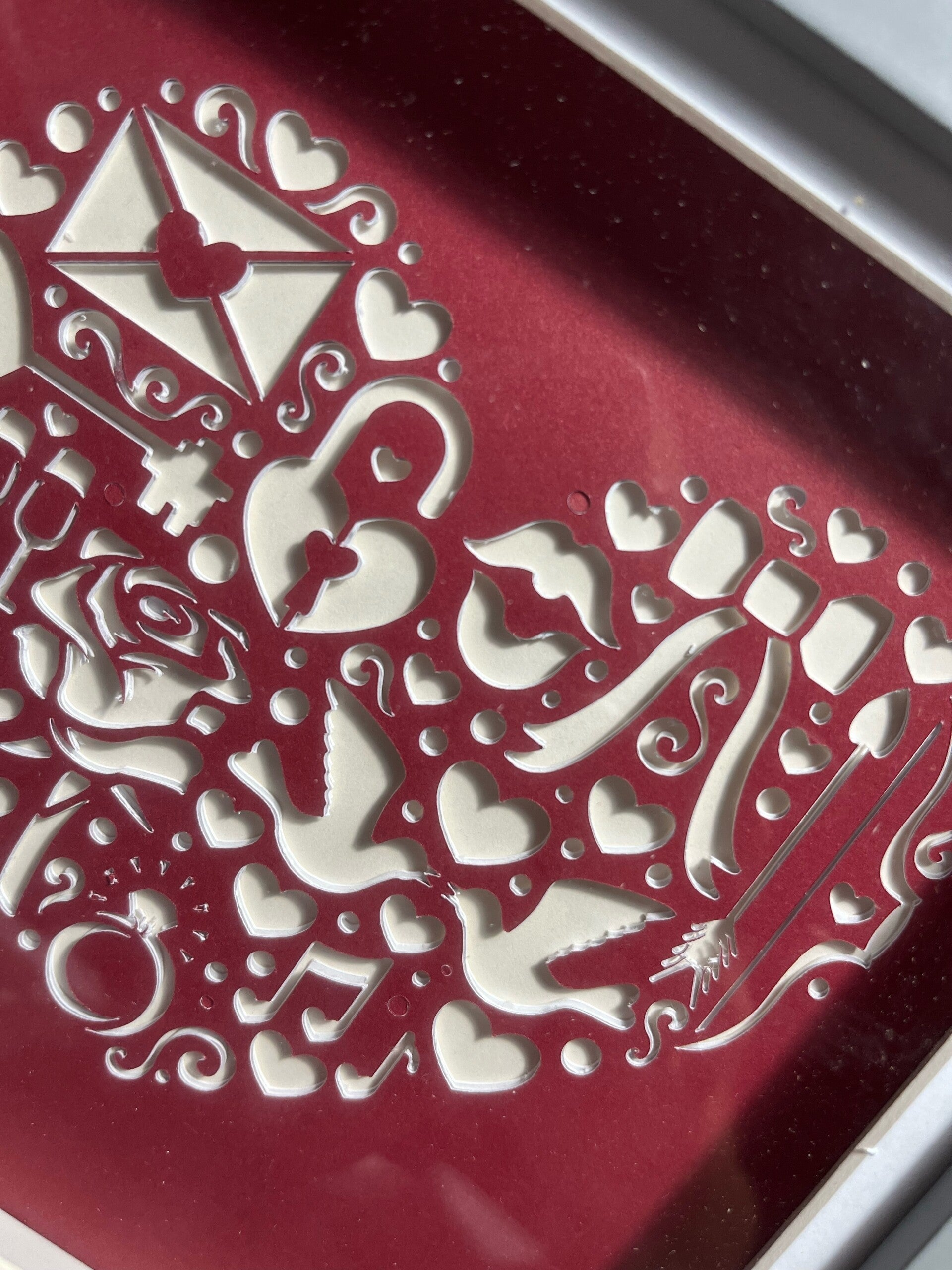 Celebrate love with this beautifully crafted heart-shaped mandala, elegantly layered in rich red and soft cream tones. Cut from premium cardstock and secured with care, the intricate design radiates warmth and harmony, making it a stunning focal point in any room.