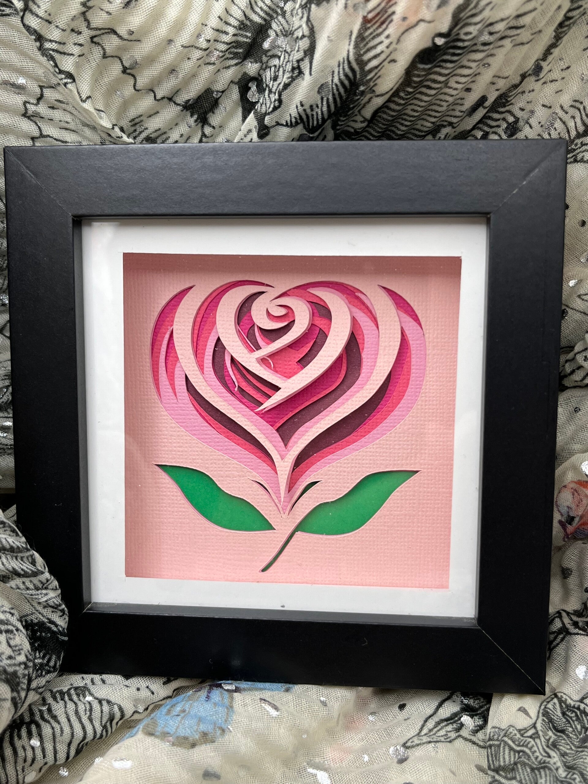A single rose, hand-layered in shades of blush, crimson, and ivory, unfurls in a spiral of devotion. Each petal is delicately cut and raised to create a soft, sculptural bloom that feels almost alive. Two verdant leaves cradle the flower, while a textured pink backdrop adds warmth and depth. This piece captures the quiet power of love — timeless, tender, and beautifully imperfect.
