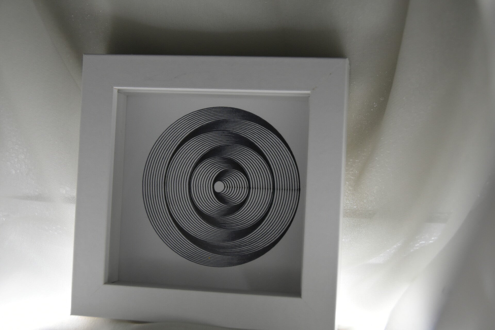 A dance of contrast and curvature, this monochrome illusion draws you inward — a ripple of thought, a spiral of stillness. Each line, varied in weight and rhythm, creates a silent pulse that seems to breathe with the viewer’s gaze. Framed in white, it becomes a window into perception itself — where simplicity meets complexity, and stillness meets movement.