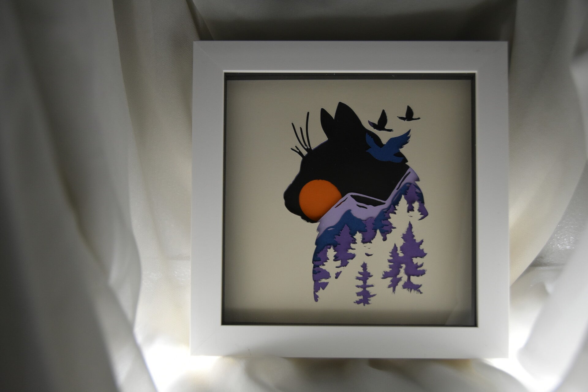 Crafted with hand-cut layers of premium cardstock and subtle lighting, this piece blends shadow and story, mystery and light. The contrast between the bold silhouette and the vibrant inner world creates a striking visual that feels both mystical and serene.