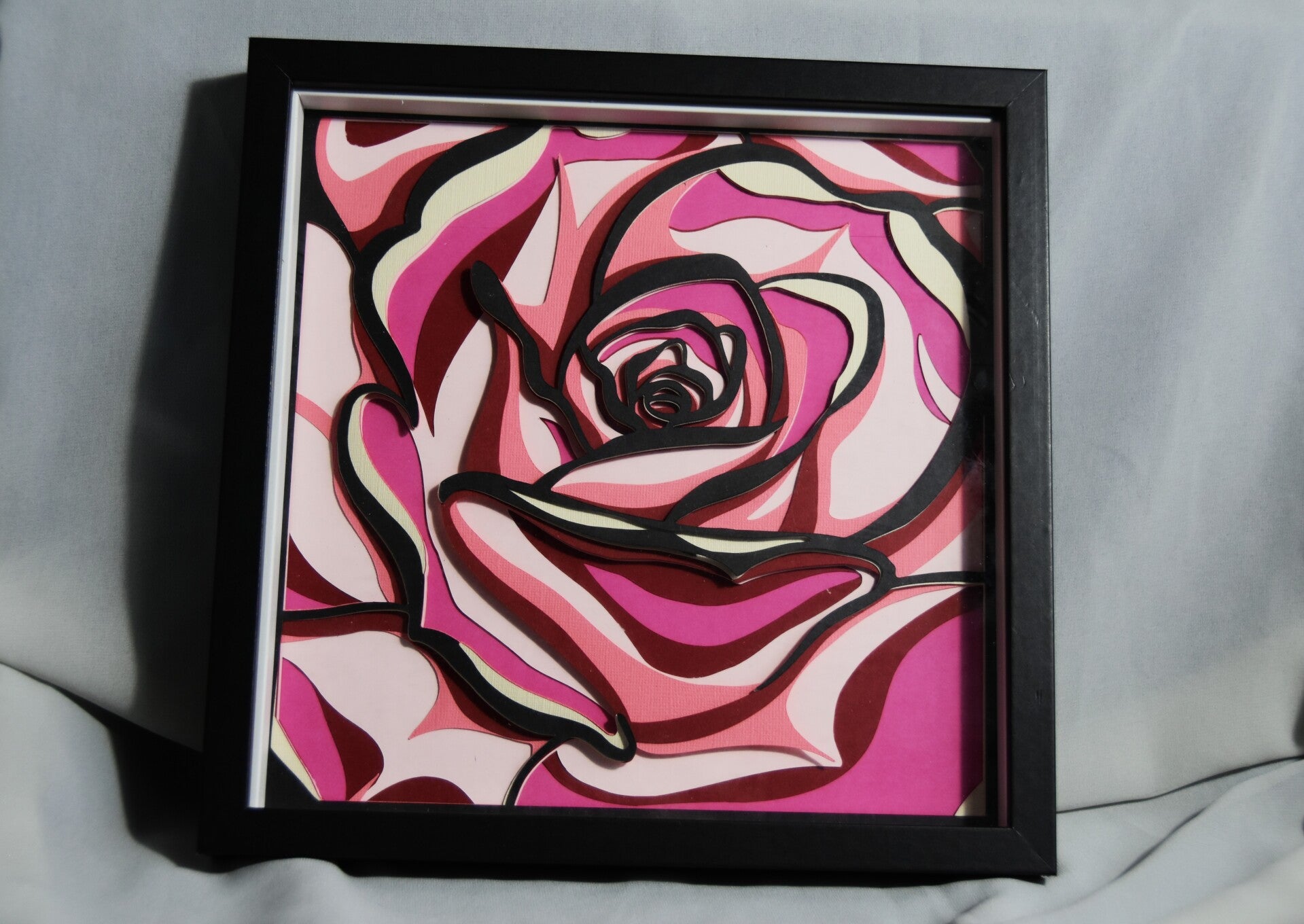 A single rose, sculpted from layers of hand-cut cardstock, blooms with quiet intensity in this elegant shadowbox. Shades of crimson, blush, cream, and deep black intertwine to form a three-dimensional floral portrait—each petal meticulously placed to evoke depth, texture, and emotion. Framed in black with a crisp white border, the composition balances drama with serenity.
