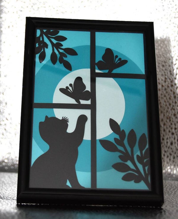 A pair of enchanting silhouette artworks, each featuring a single playful black cat in pursuit of a butterfly. Set against dreamy shades of blue and framed within a window-like scene, these pieces evoke quiet wonder and feline curiosity. Presented in sleek 11x16cm black frames, they make a perfect gift for cat lovers or a whimsical addition to any cozy nook.