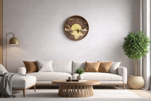 Step into a moment of pure stillness with this beautifully layered wooden artwork, a serene scene that invites the viewer to pause and breathe. A lone sailboat drifts toward the horizon, framed by sweeping mountains and gentle clouds, while a glowing moon rises—or perhaps the sun sinks—behind it, casting a soft reflection across calm waters.